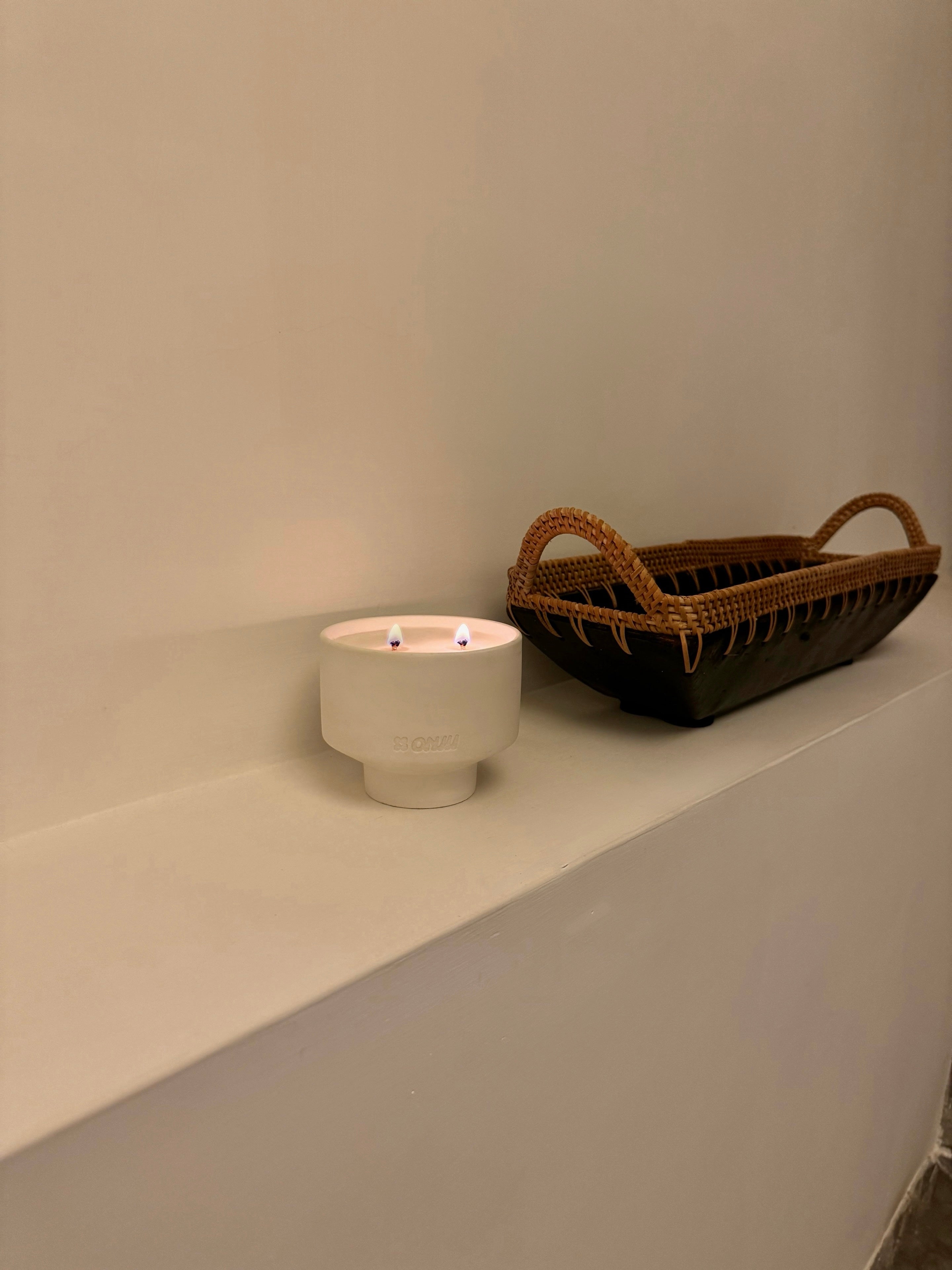 The Onju LOVE Candle features a blend of pure soy and beeswax, with two coated cotton wicks that allow for an even, long-lasting burn.